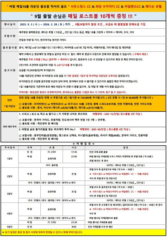 | ⛳인도네시아 바탐섬 3색 무제한 골프패키지 749,000원부터 (0) | 2025.07.01 |