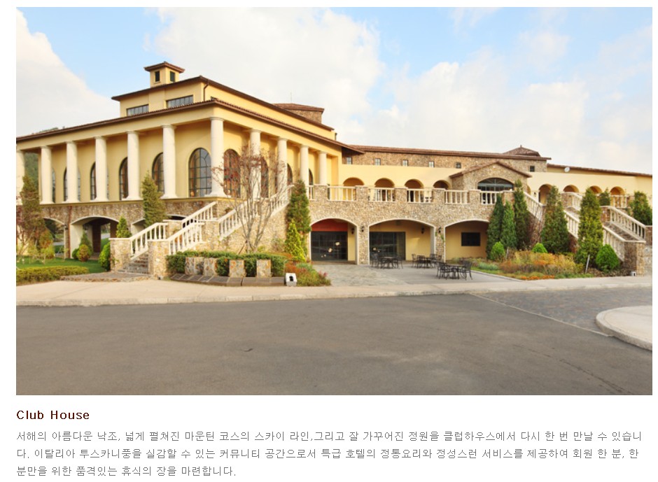 세계적골퍼 소렌스탐이 설계한 천혜의 자연환경 위 설계된 마운틴,오션,벨리 코스의 27홀 회원제 골프장으로 이국적 풍치의 이탈리아 투스카니 스타일 클럽하우스와 대저택 컨셉의 골프텔로 구성되어 있습니다.