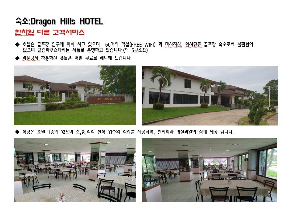 · 드래곤힐스는 골프텔 이용기준이며 골프장 정문 앞 위치 하여 골프 코스까지 차량이동