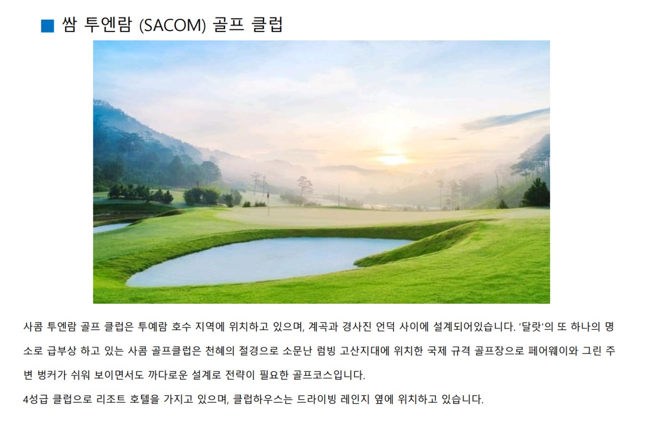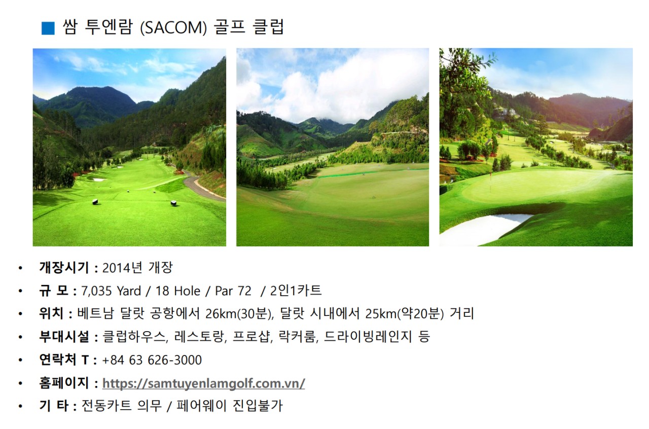 ⛳달랏 쌈투엔람CC는 베트남의 아름다운 고원 도시인 달랏에 위치한 매력적인 골프장입니다. 이 골프장은 2014년에 개장하였으며, 달랏 시내에서 약 13km, 차량으로는 약 25분 거리에 있는 투엔람(Tuyen Lam) 호수 지역에 자리잡고 있습니다. 사콤(Sacom) 은행이 소유하고 있는 이 골프장은 자연 경관과 조화를 이루며 설계되었습니다.