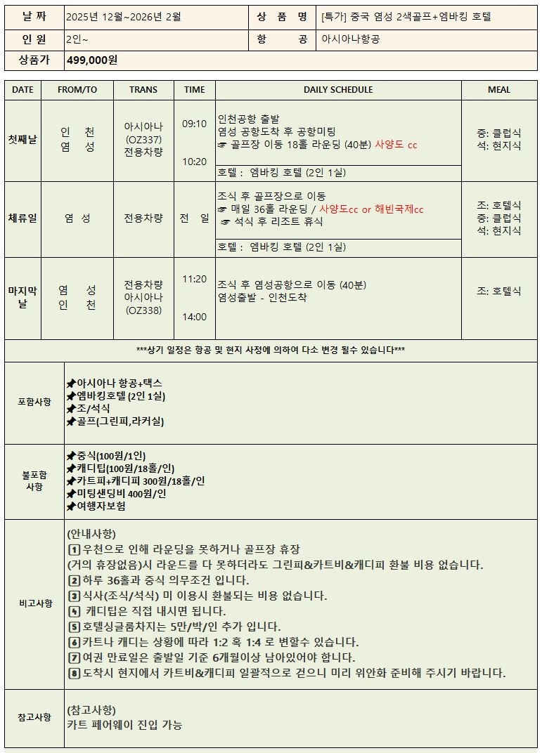 🚨염성 2색골프+엠바킹호텔(특급)🚨