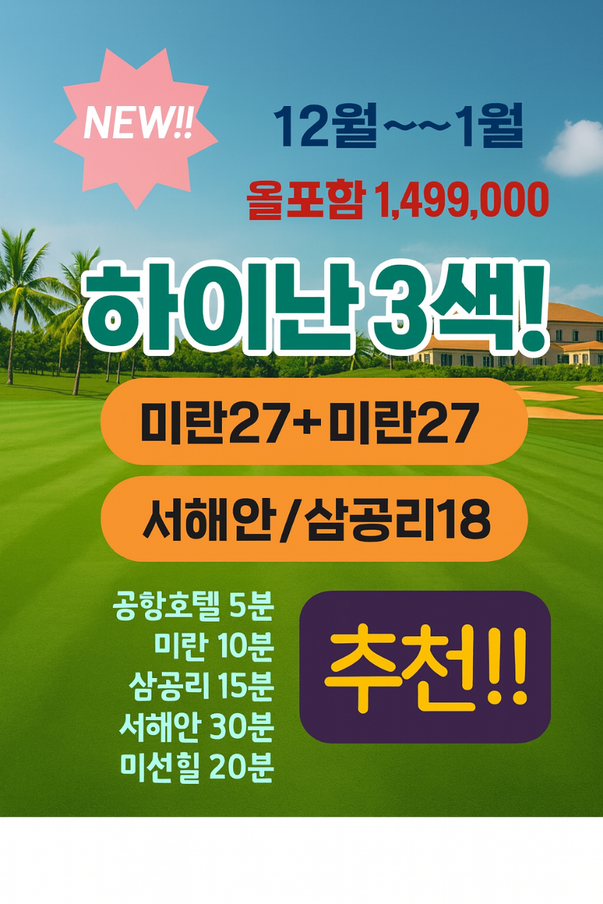| 중국 하이난 2색골프 고염전CC 미란CC 올포함 패키지 (0) | 2025.12.03 |
