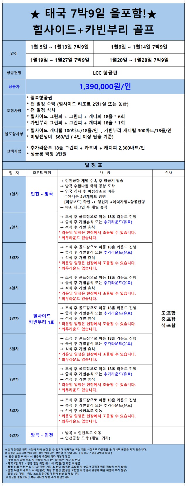 * 힐사이드 2인1카트/2인1캐디 카빈부리 1인1카트/1인1캐디 기준