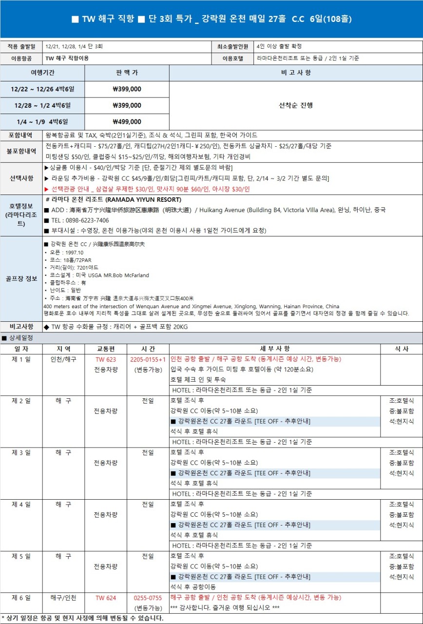 | 중국 하이난 연말연시 하이난VIP 3색골프 지정일특가! (0) | 2025.12.15 |