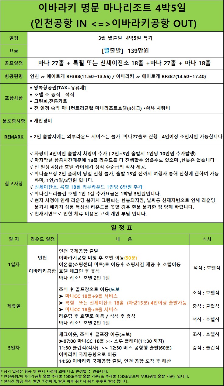 | 일본 이바라키골프 4월 명문 2색 4박5일 저정일 특가!! (0) | 2026.02.25 |