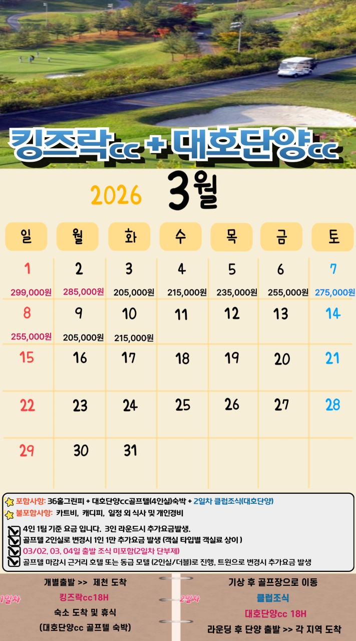 | 충북골프 대호단양CC 3월 1박2일골프 패키지 (0) | 2026.02.19 |