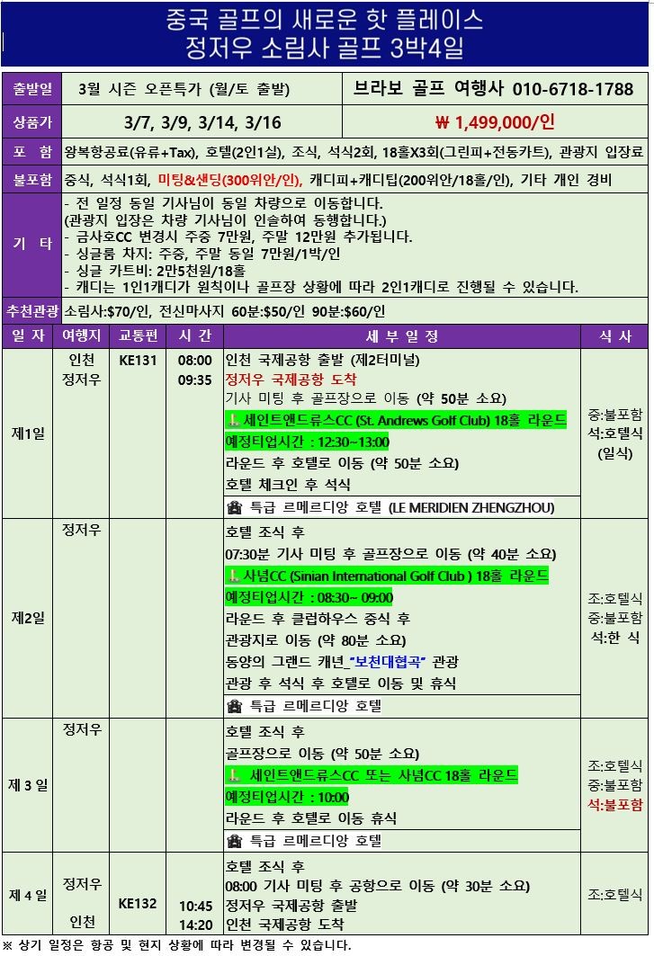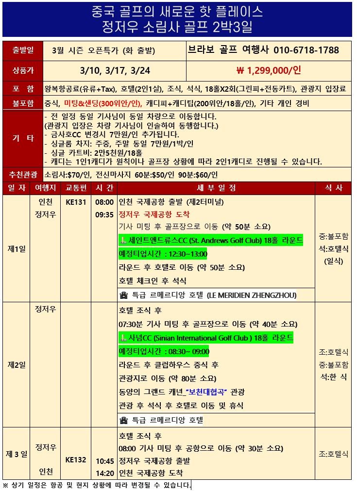 ⛳중국 정저우 소림사 골프 & 관광 패키지