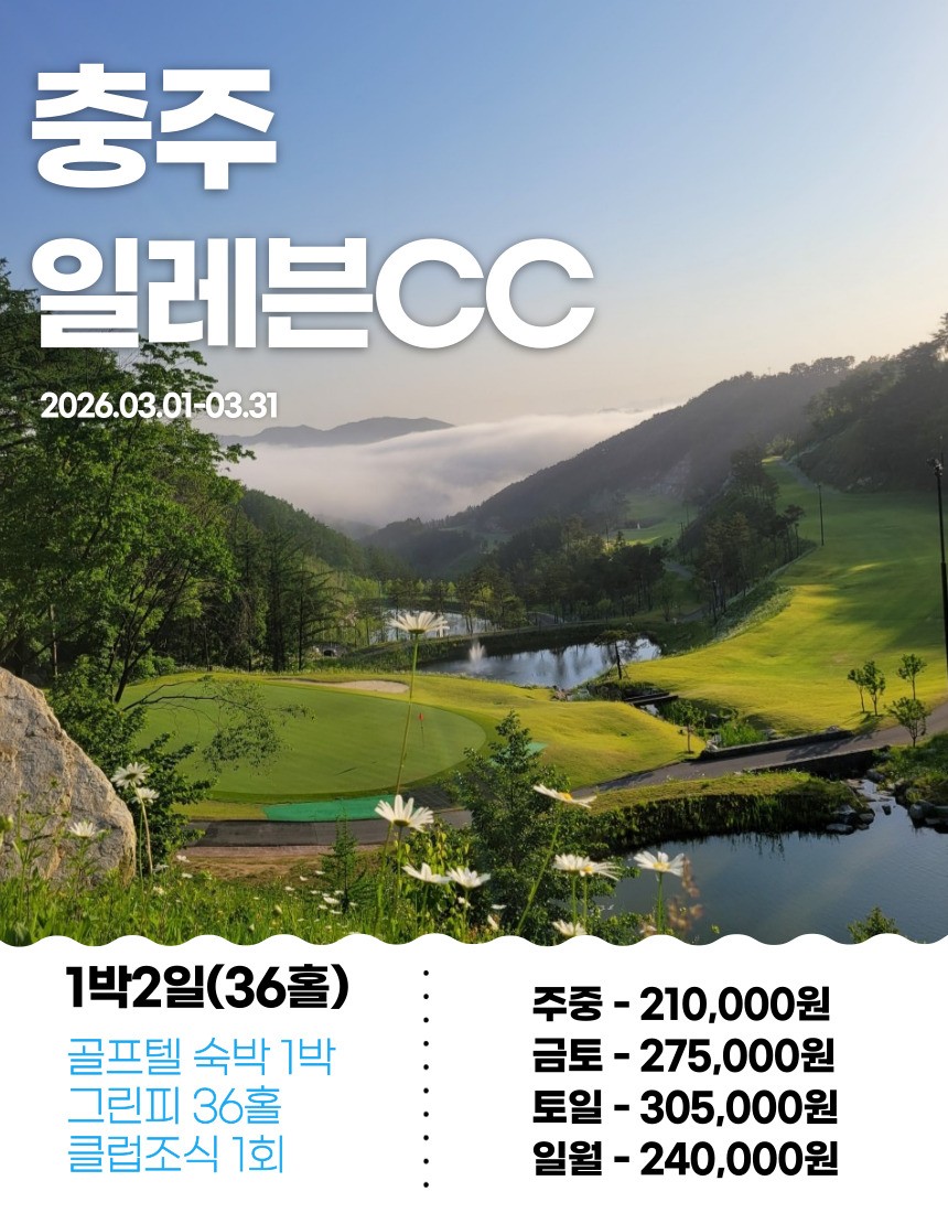 | 충북 2색골프 킹즈락CC+대호단양CC 3월 1박2일골프 패키지 (0) | 2026.02.23 |