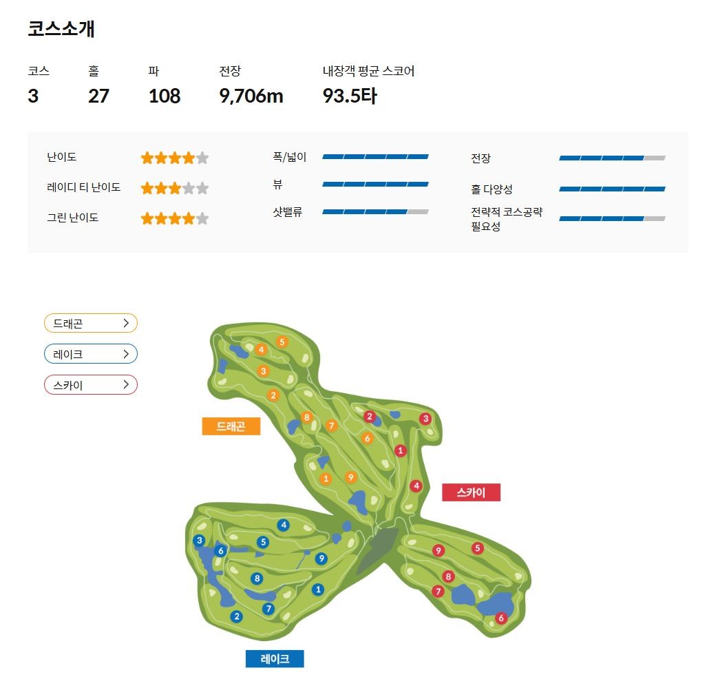 드래곤CC는 생각을 요구하는 드래곤 코스, 탁 트인 푸른 호수를 감상할 수 있는 레이크 코스, 다양한 홀을 경험할 수 있는 스카이 코스로 구성된 27홀 대중제 골프장 입니다.