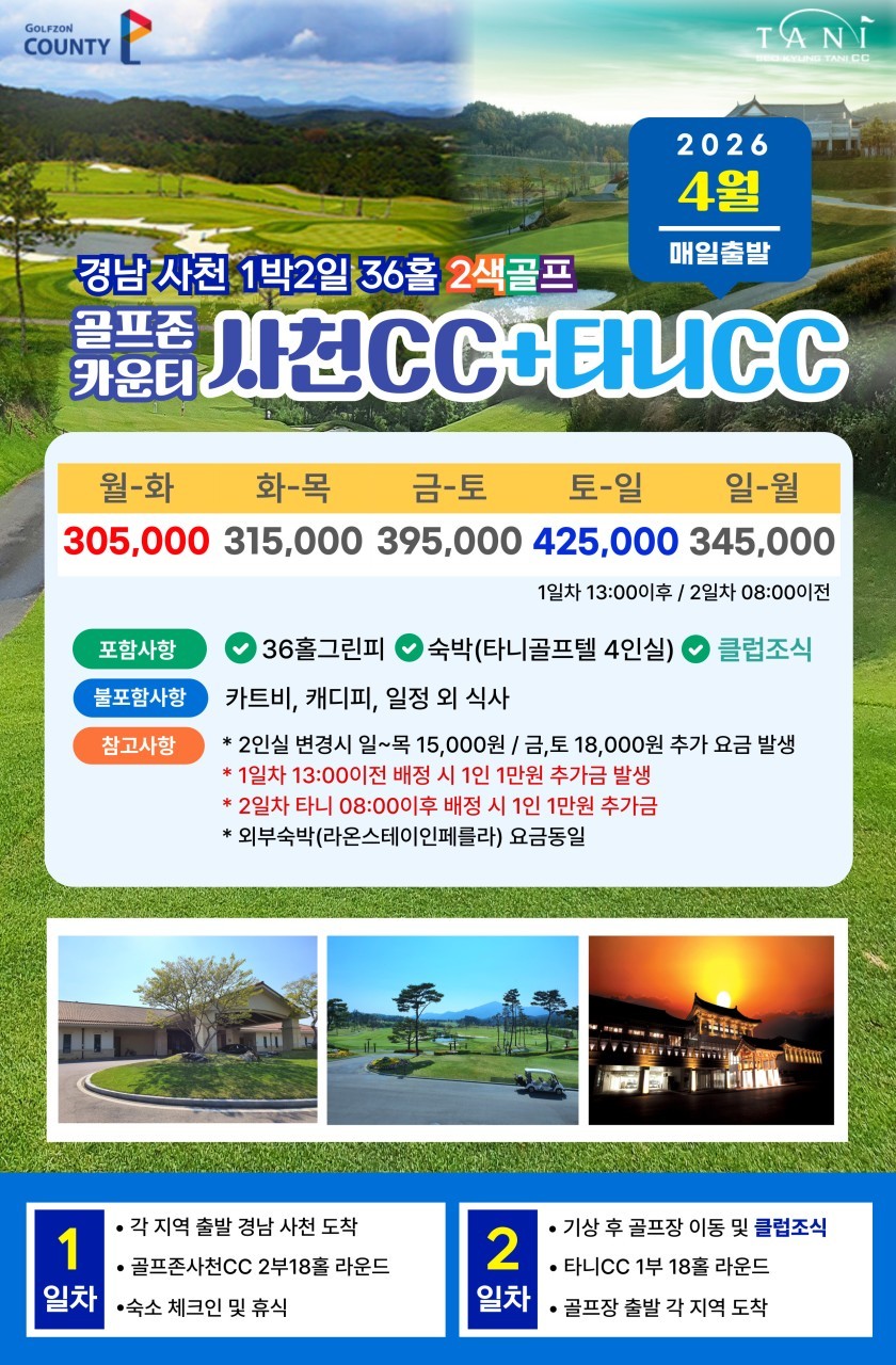 | 경남골프 골프존카운티 사천CC 4월 1박2일골프 패키지 (0) | 2026.03.07 |