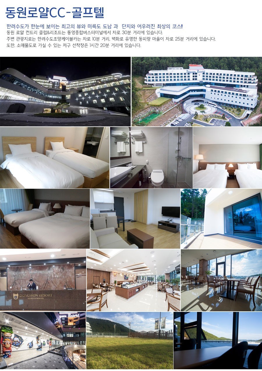 동원로얄CC는 한려수도가 한눈에 보이는 최고의 뷰와 국내 최장의 통영 케이블카 및 도남관광단지와 어우러진 최상의 코스를 자랑하는 명품 컨트리클럽 으로 한려, 미륵 18홀 대중제 골프장 입니다