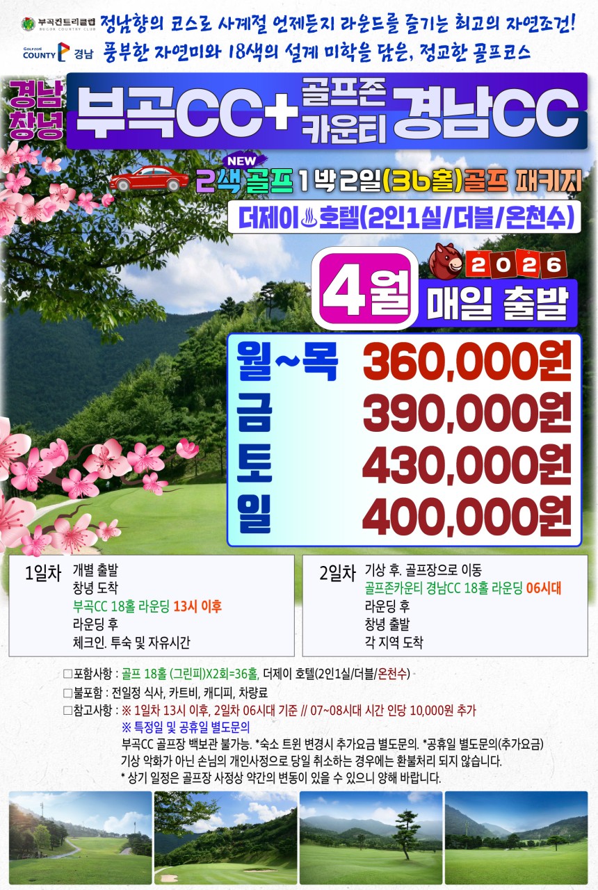 | 경남골프 창녕 부곡CC 4월 1박2일골프 패키지 (0) | 2026.03.14 |