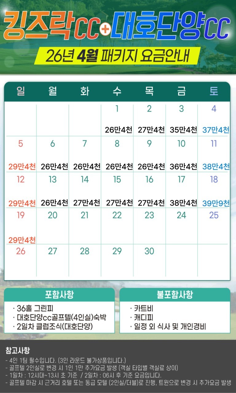 | 충북골프 청주 세레니티CC 4월 1박2일골프 패키지 (0) | 2026.03.26 |