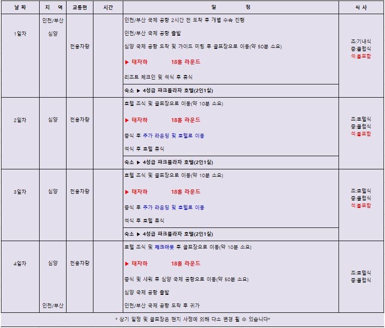 ※ 지방(부산 및 제주) 출발편은 첫날 9홀 진행이며 2일차(주중/주말) 9홀 추가 진행해드립니다.