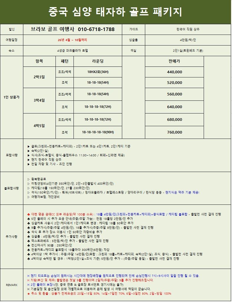 ♣ 4박이상 1박 추가시 : 주중/주말 14만원/인(포함 : 그린피 18홀+카트+캐디피, 숙박(2인1실), 조식, 중식) - 출발전 사전 결재 진행