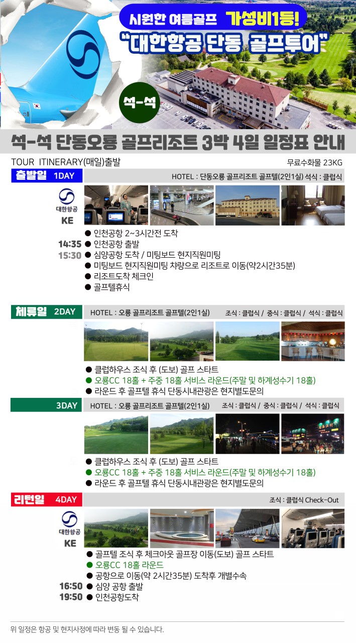 심양골프패키지로 단동에 위치한 오룡CC 리조트 패키지는 여름 시원한 라운딩 골프장으로 2인부터 출발 가능하고 주중 18홀 추가 서비스와 전일정 식사 포함된 상품입니다.
