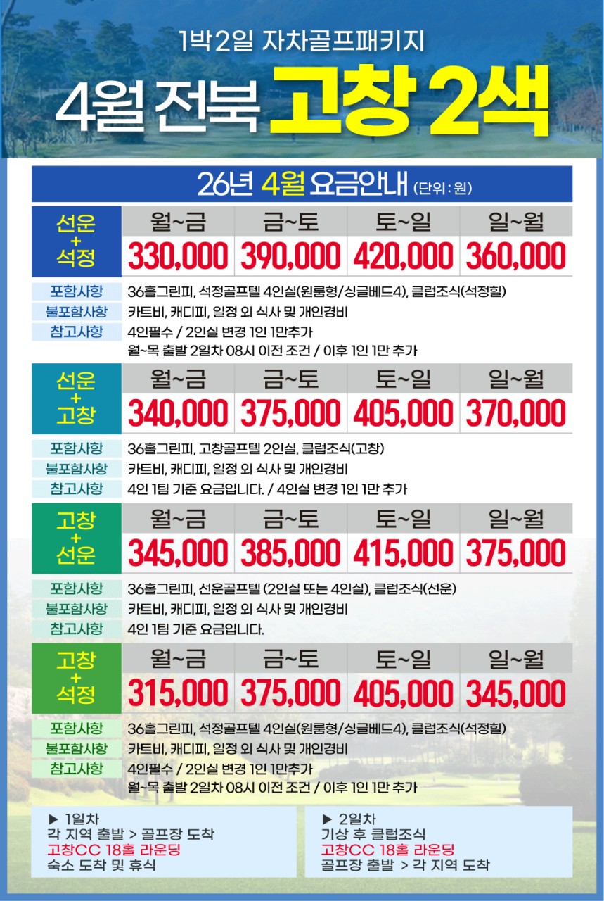 | 전북골프 정읍 내장산CC 4월 1박2골프 패키지 (0) | 2026.03.24 |