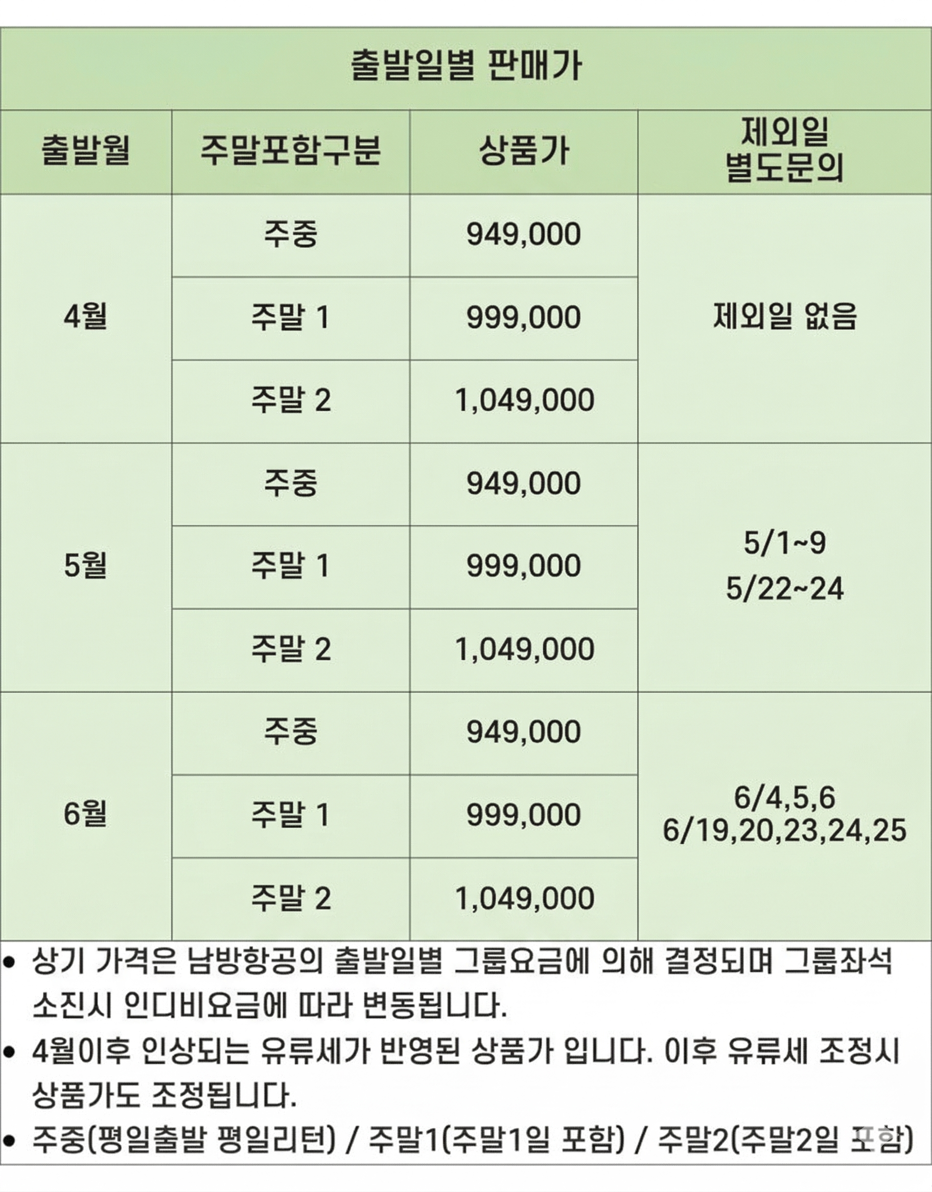 *상품가 구분 : 주중(평일출발 평일리턴) / 주말1(주말1일 포함) / 주말2(주말2일 포함)