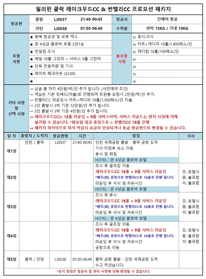 (LJ037) 인천-클락 21:40 - 00:45+1일